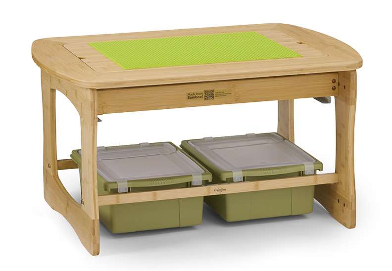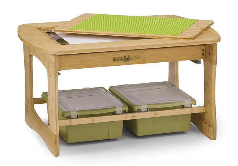 The construction brick table top is also removeable, giving kids the freedom to build and play on the floor or at another table when the light table is being used. When not in use, it slides neatly into a built-in storage slot, perfect for switching up your learning centers throughout the day. To keep everything organized, the storage tubs come with lids to keep manipulatives and materials idea and close at hand.