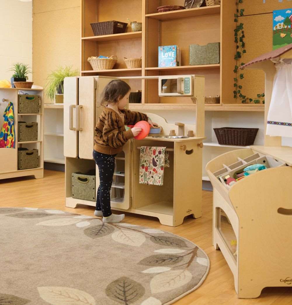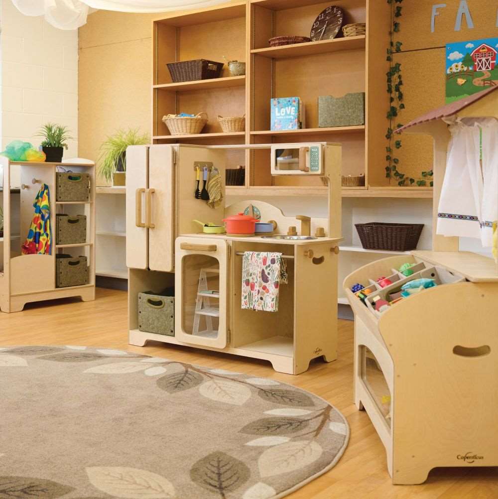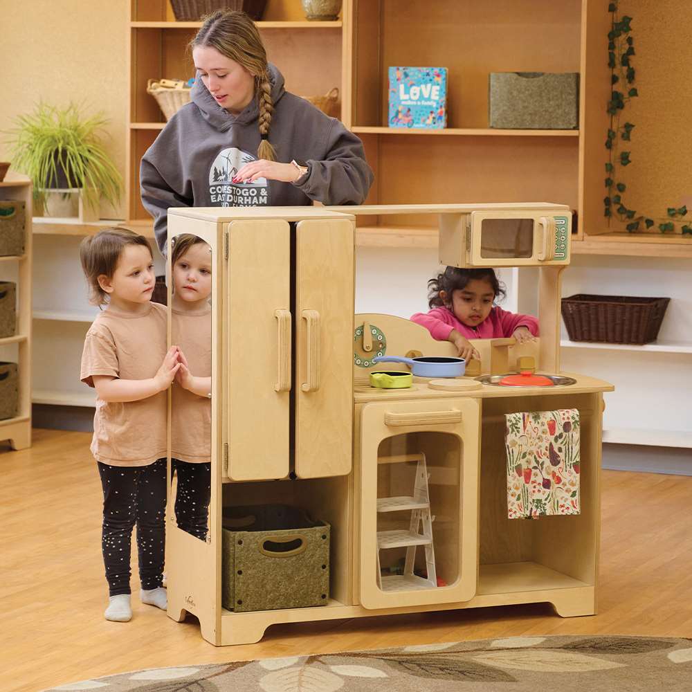 No early childhood room is complete without a kitchen. Our Kitchen Combo includes a fridge with double doors, sink, cooktop with two burners that spin, grill, stove, a microwave, and even a clock. There are plenty of hooks for utensils, storage cubbies, a Softouch storage bin, a spot for a towel and all the knobs turn for a realistic feel - you need to know the faucet has been turned on after all! There are zero pinch points because of our unique hinge design, and the grill and sink can be fastened in place if desired.