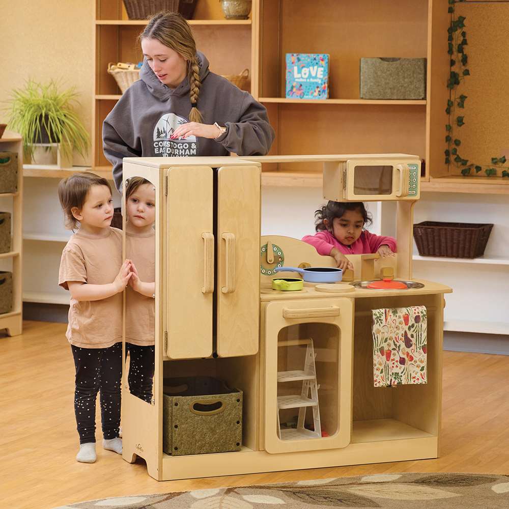 No early childhood room is complete without a kitchen. Our Kitchen Combo includes a fridge with double doors, sink, cooktop with two burners that spin, grill, stove, a microwave, and even a clock. There are plenty of hooks for utensils, storage cubbies, a Softouch storage bin, a spot for a towel and all the knobs turn for a realistic feel - you need to know the faucet has been turned on after all! There are zero pinch points because of our unique hinge design, and the grill and sink can be fastened in place if desired.