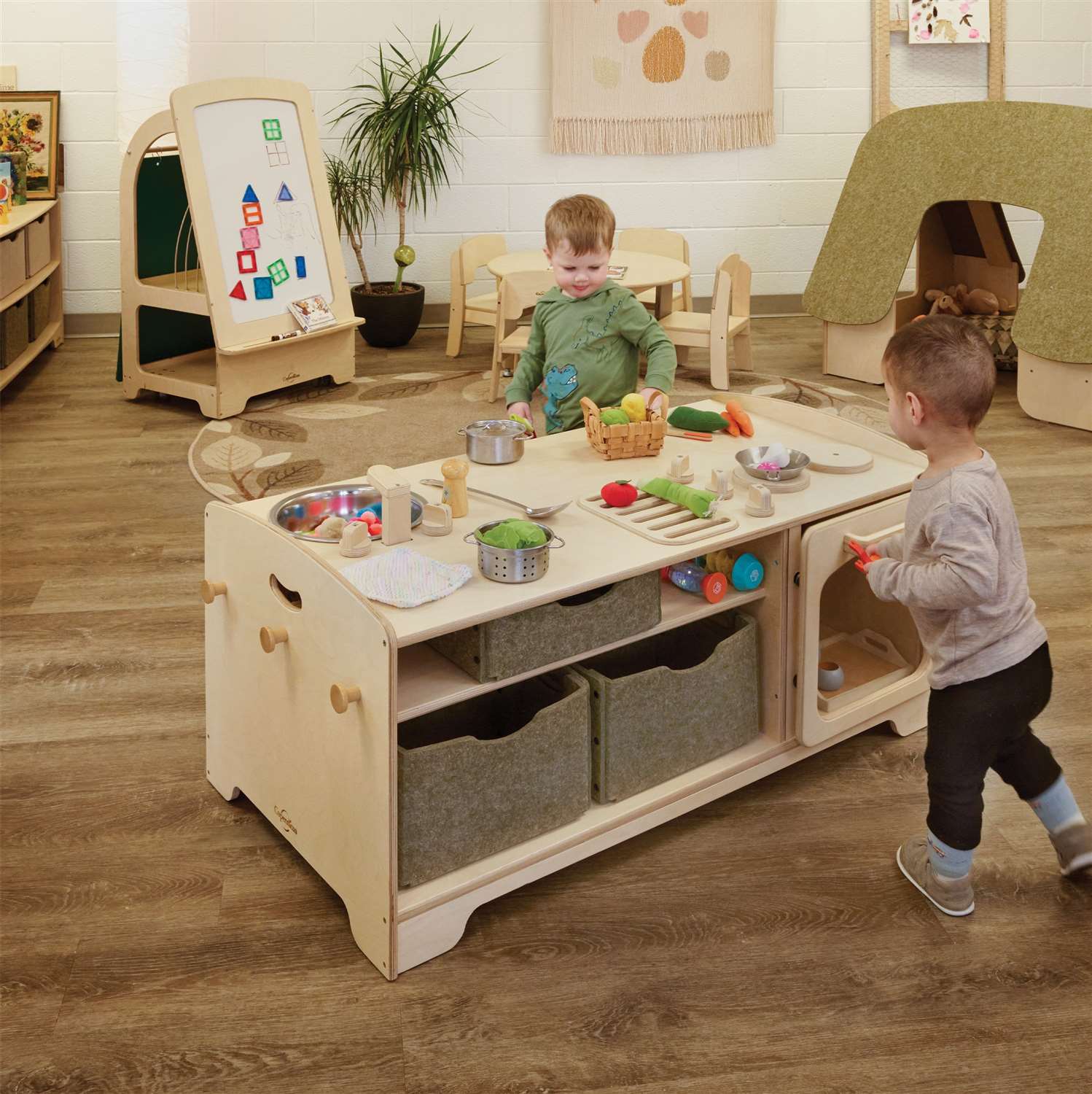 Spark collaborative and imaginative play with our Kitchen Island that is fully equipped and offers all round access for make believe and role play. It includes a sink, two burners, grill, a washer/dryer, a stove with burners that spin, storage cubbies with bins, a spot for a towel and all the knobs turn. The open counter space provides lots of room for food prep and collaboration. There are zero pinch points because of our unique hinge design, and the grill and sink can be fastened in place if desired.