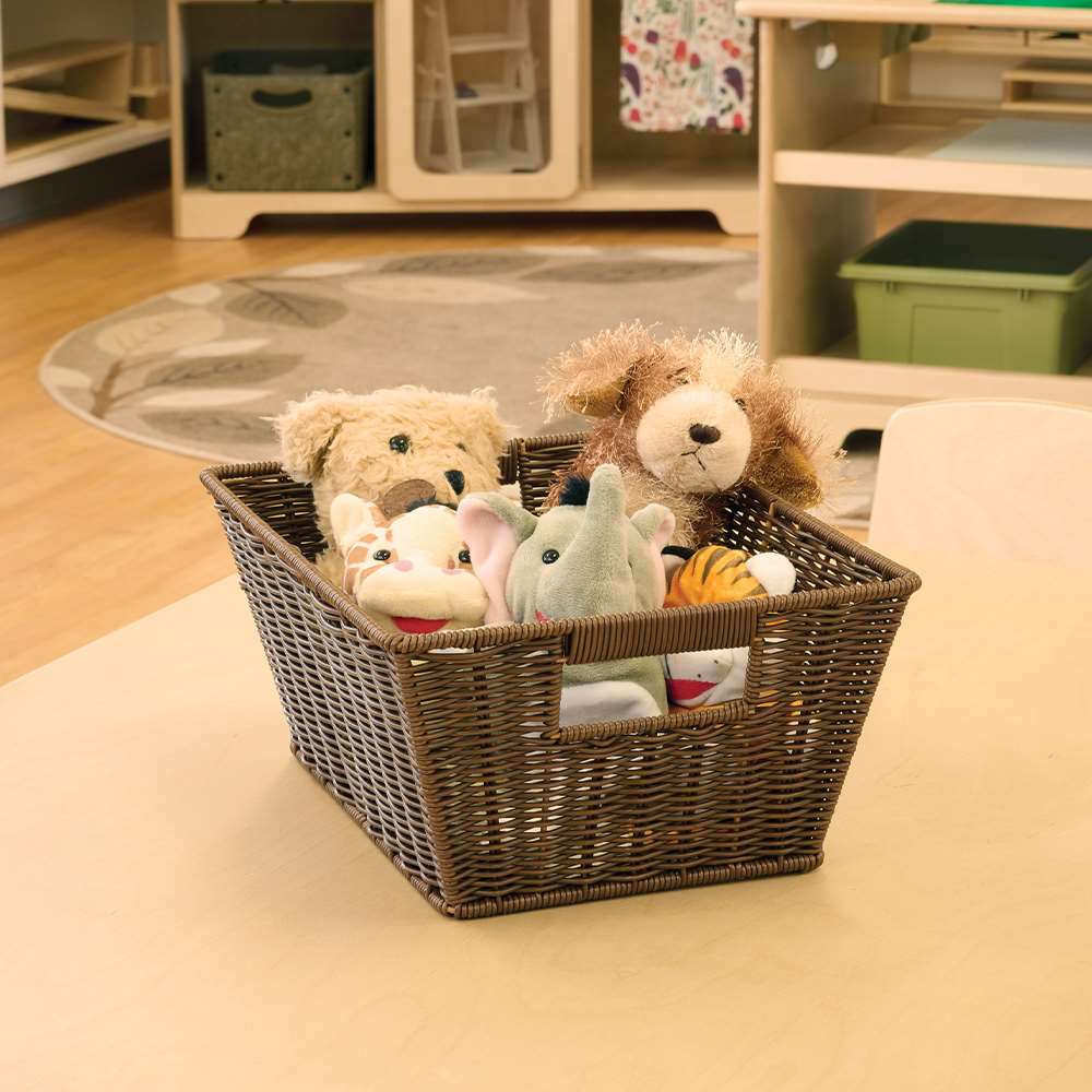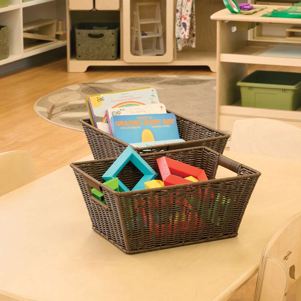 The natural look of our wicker baskets creates a homey vibe in early childhood and classroom environments and they coordinate nicely with our Seoras Collection of Birch furniture line. These baskets are made of durable polypropylene filament wound around a metal wire frame and are resistant to moisture. This set of three is compatible with our Seoras Shelving Collection.