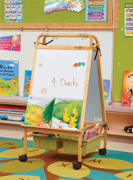Just because you have a tight budget doesn't mean you can't have a useful teaching easel. This easel includes a durable, magnetic whiteboard, sturdy casters, two with foot-activated breaks and two shelves for storage. This model includes four Large Open Tubs that hold 10 lbs. each. We also offer this easel without tubs so you can add your own storage bins.