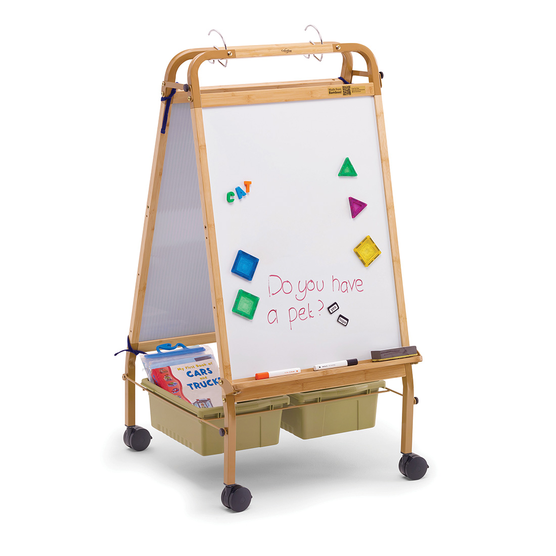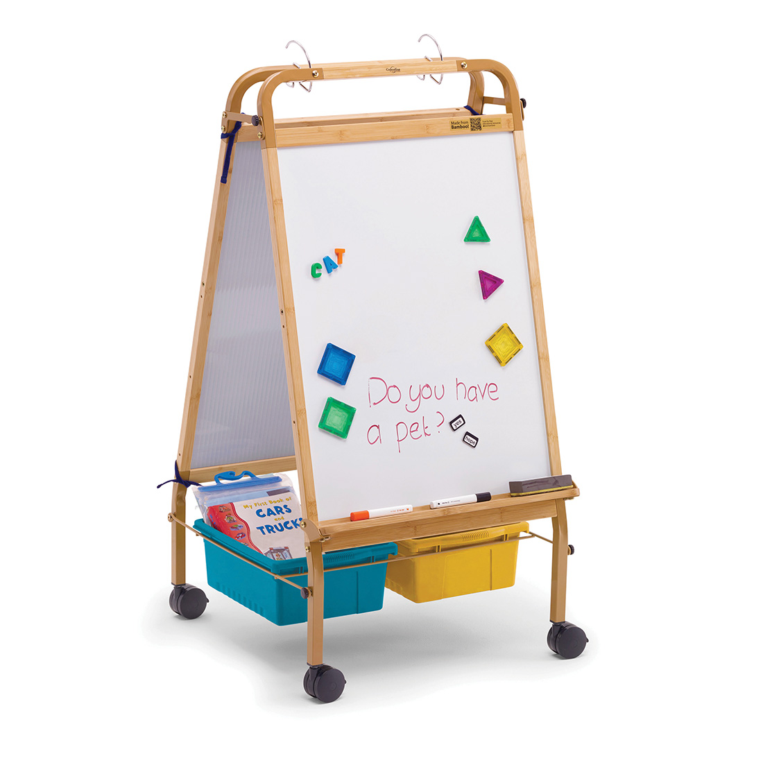 Our popular Primary Teaching Easel is now available in bamboo! The Bamboo Primary Teaching Easel is a valuable tool for early childhood and primary teachers to orchestrate and store lessons. With room for two little learners,  independent and group lessons are a breeze. This easel has an extra long front dry-erase board that measures 40” H x 28” W to accommodate little learners and includes a rear felt board.